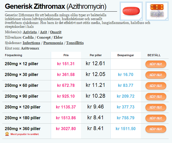 Det säljs under många andra namn : Azitromax, Zithromax, Azithromycin Actavis, Azithromycin Jubilant, Azithromycin Krka, Azithromycin Mylan, Azithromycin Orifarm, Azithromycin Sandoz, Azithromycin STADA, Azitromax, Azyter